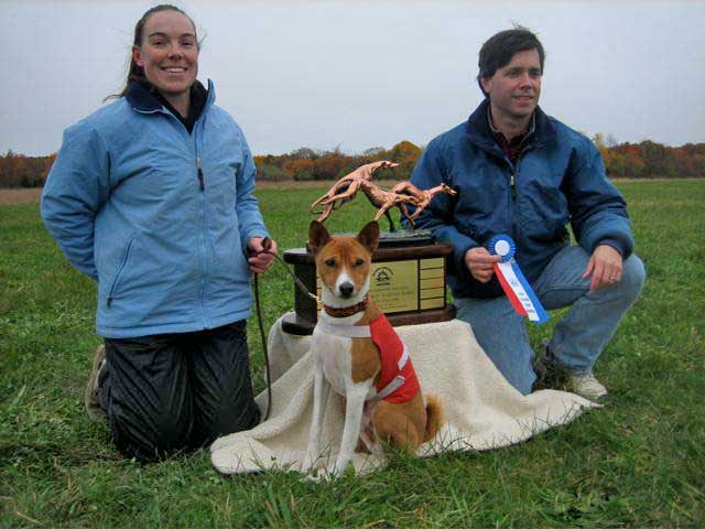 She got her first point on July 18th, 2012. Fiddle had all of her AKC Novice agility titles by her 2nd birthday. She is a Bred-by Champion. She has 4 GCH points. She is a BCOA Master Versatile Basenji.